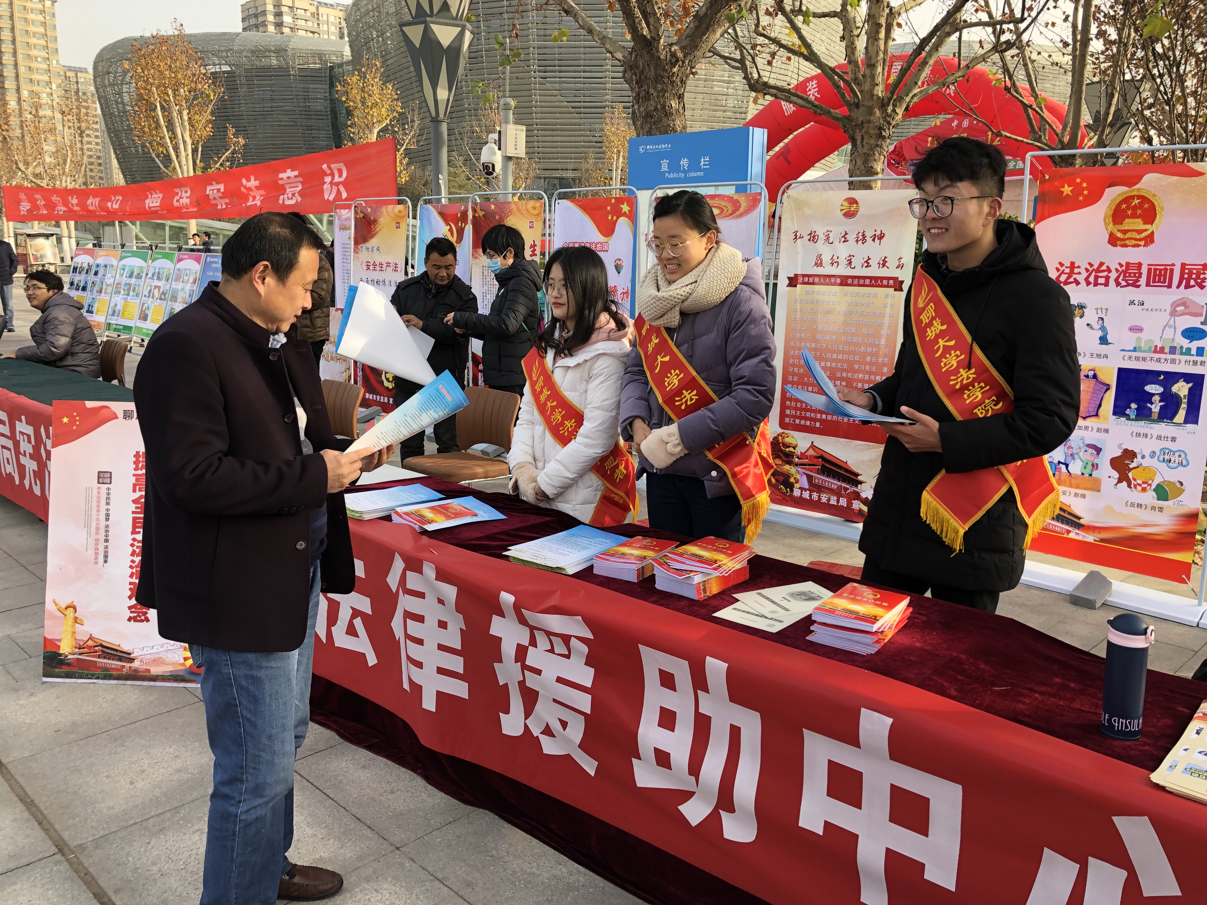 在市法律援助中心工作人员的带领下,志愿者向广场上的市民分发宣传手册,并向市民介绍国家宪法日的含义、意义与作用等基础知识,表示国家宪法日不仅是一个纪念日,更是全民的宪法“教育日、普及日、深化日”,同时志愿者结合自身法学知识与切身经历体会,传播尊重宪法、宪法至上和用宪法维护人民自身权益的的法治精神,并对需要帮助的市民给予现场法律援助,解决市民日常生活中法律上的困难,切实做到学为所用、学以致用。此外,王彤宇、孟宪东来到活动现场对志愿者宣传宪法精神、普及法律知识的做法予以充分的肯定和支持。