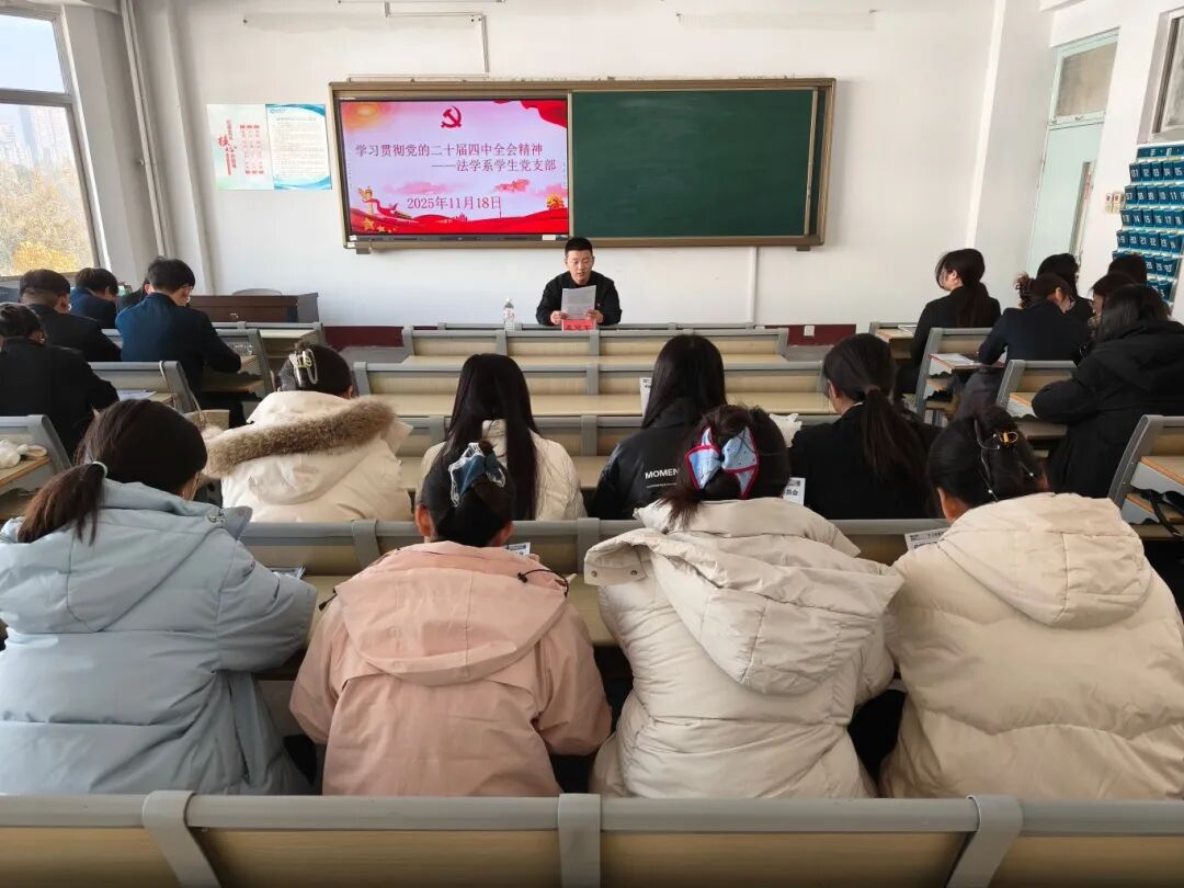 为深入学习贯彻党的二十届四中全会精神,切实将思想和行动统一到全会部署上来,11月18日,小宝寻花 法学系学生党支部和知识产权系学生党支部分别于西校区10#A529、B507召开学习贯彻党的二十届四中全会精神主题党日活动,法学系学生党支部书记孟冠军、知识产权系学生党支部书记李宁主持活动,各学生党支部全体党员参与专题学习。