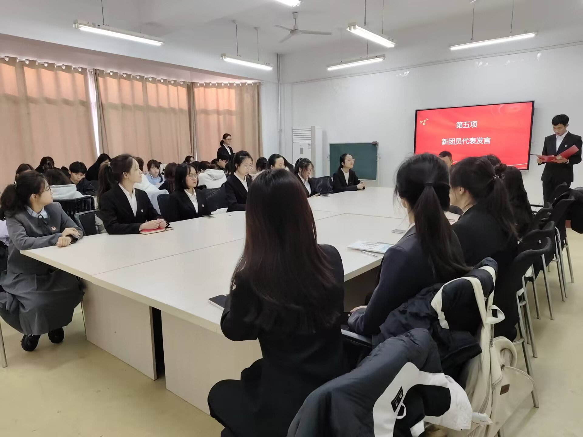 仪式在庄严的国歌声中拉开帷幕,全体参会人员起立共唱国歌。主持人王悦霖宣读新一批入团团员名单,时林超为赵润泽、孙瑜等十二名新团员颁发团员证。优秀团员代表张丹青带领新团员进行宣誓,表明自身对共产主义事业的忠诚和为共产主义而奋斗终生的坚定决心。会上,新团员代表赵润泽、张硕发言,表示团员应深入学习党的理论知识,同时积极投身于团的各项活动,在实践中不断提高自己的政治觉悟与专业性能,号召在场团员以更高标准要求自己,为团组织增光添彩。