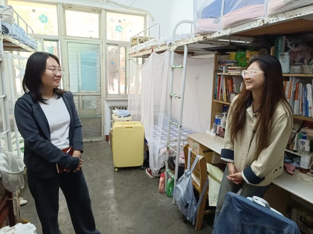 本次活动重点检查了宿舍用电安全与卫生环境,表扬了部分寝室整洁有序的内务,对存在安全隐患、内务杂乱的宿舍现场提出了整改意见。刘洁与同学们亲切交谈,详细询问生活适应情况与学业进展,叮嘱同学们“有困难及时向学院反馈”。她强调,“安全无小事,宿舍是大学生活的重要空间,要共同维护和谐、健康的居住环境。”